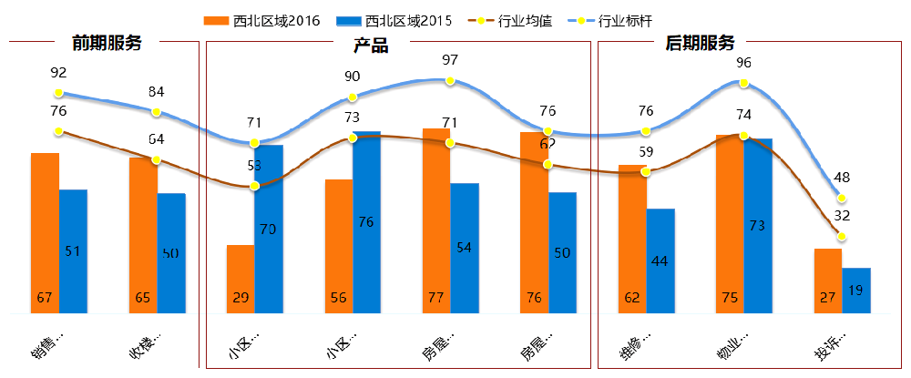 從下方圖形中可看出:XXXX西北區(qū)域業(yè)主在銷售服務、收樓交房、房屋設計、房屋質量、維修服務、物業(yè)服務、投訴處理七大方面的滿意度評價相比去年有所提升,但業(yè)主對小區(qū)配套、小區(qū)環(huán)境和規(guī)劃兩個方面的滿意度評價相比去年有所下降,每個客戶體驗端口與行業(yè)均值*及行業(yè)標桿*均存在較大差距,所以后期仍需努力提升。