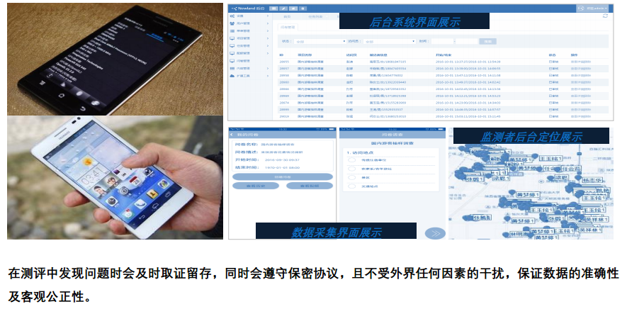 公司有著自主研發(fā)的數(shù)據(jù)采集系統(tǒng),以智能手機或平板電腦為載體,事先將制定指標體系從系統(tǒng)后臺導(dǎo)入,執(zhí)行過程中的問題記錄是通過觸摸屏直接記錄,并傳送到系統(tǒng)終端,實現(xiàn)數(shù)據(jù)時時記錄時時上傳,系統(tǒng)后臺可觀測到監(jiān)測者的實時定位,從多種方面保證了數(shù)據(jù)的真實有效性。此系統(tǒng)的八大特點: