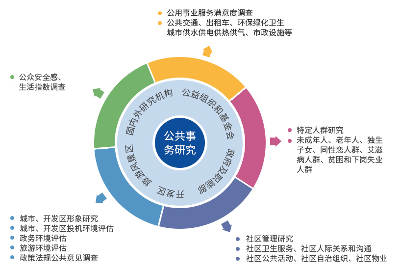 主要研究范圍包括教育、金融、公共衛(wèi)生、就業(yè)、交通、養(yǎng)老服務、社區(qū)發(fā)展等方面的調研咨詢項目。
