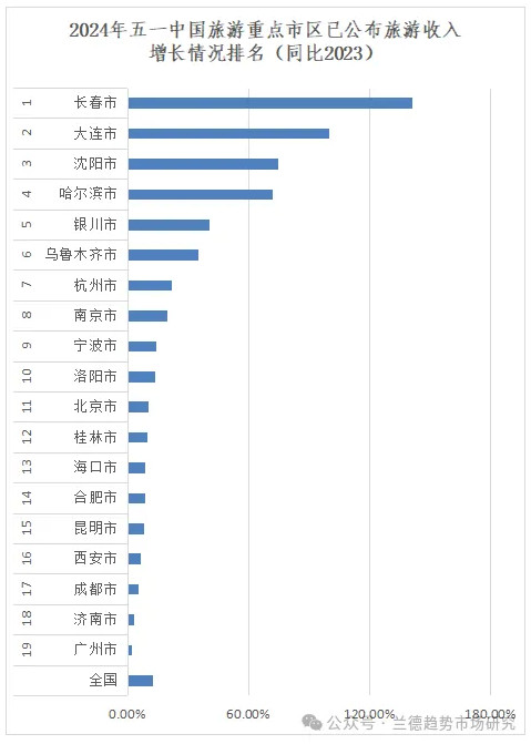引入增長統(tǒng)計的原因在于,旅游絕對值數據受經濟、人口、地域面積、旅游資源分配等影響,即便統(tǒng)計結果準確也不能反映當地旅游發(fā)展速度,增長統(tǒng)計結果在一定程度上能夠看出當地當年或者當期在旅游經濟發(fā)展上所做的努力。增長率統(tǒng)計主要采用的是2024年五一和2023年五一同比數據。